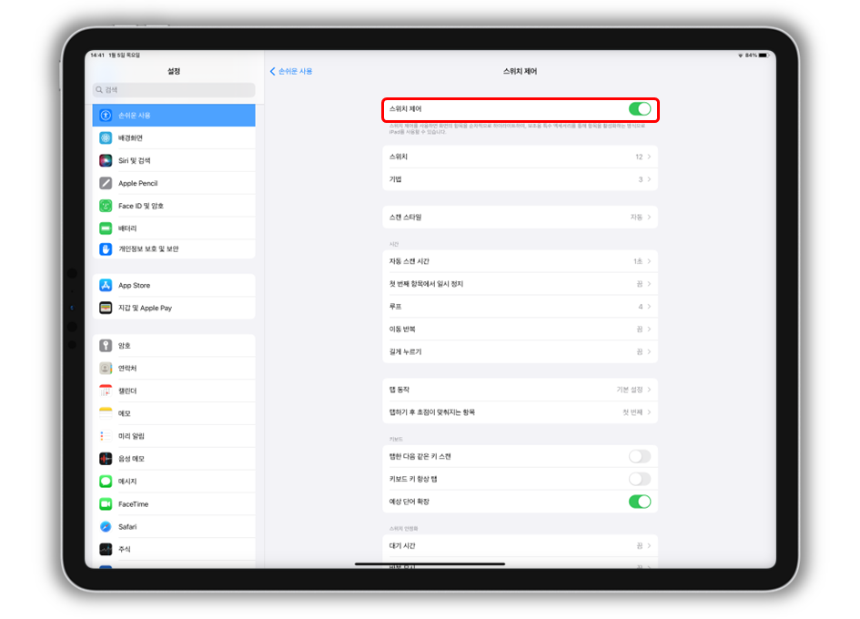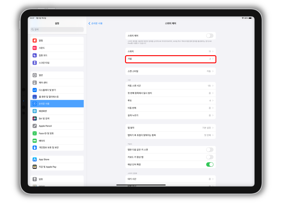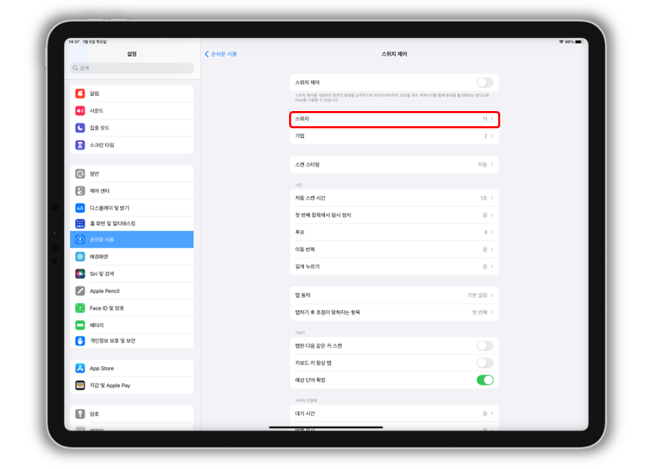 "설정 > 손쉬운 사용 > 스위치 제어"로 들어가 주세요.
