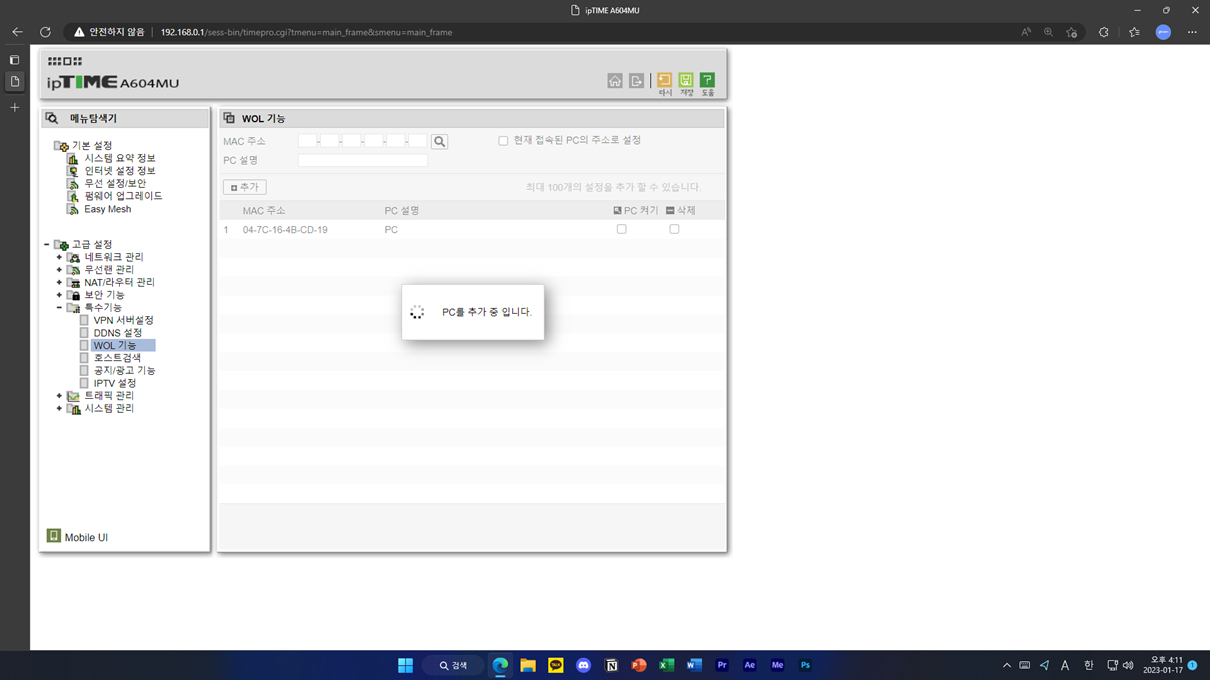 원격으로 켜기 원하는 컴퓨터에서 공유기의 설정페이지로 접속해 주세요.