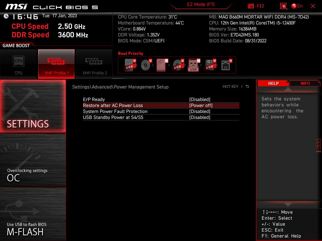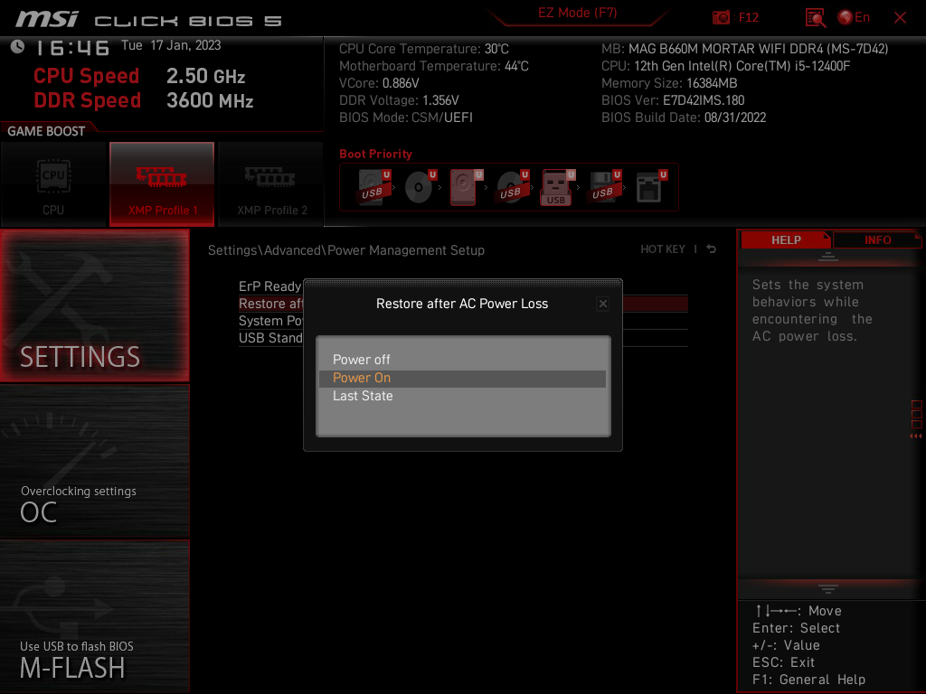 Advanced > Power Management Setup 경로로 들어가서 'Restore after AC Power loss'의 설정값을 'Power On'으로 변경해 주시고 저장해 주시면 바이오스 설정을 마무리되었습니다.