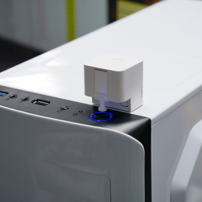 이를 활용해서 스위치봇을 사진처럼 전원 버튼을 누를 수 있는 자리에 위치시키고, 스위치봇 앱으로 작동시킬 수 있게 설정하면, 복잡한 다른 설정 없이도 위 사진처럼 간단하고 확실하게 설치를 할 수 있습니다.